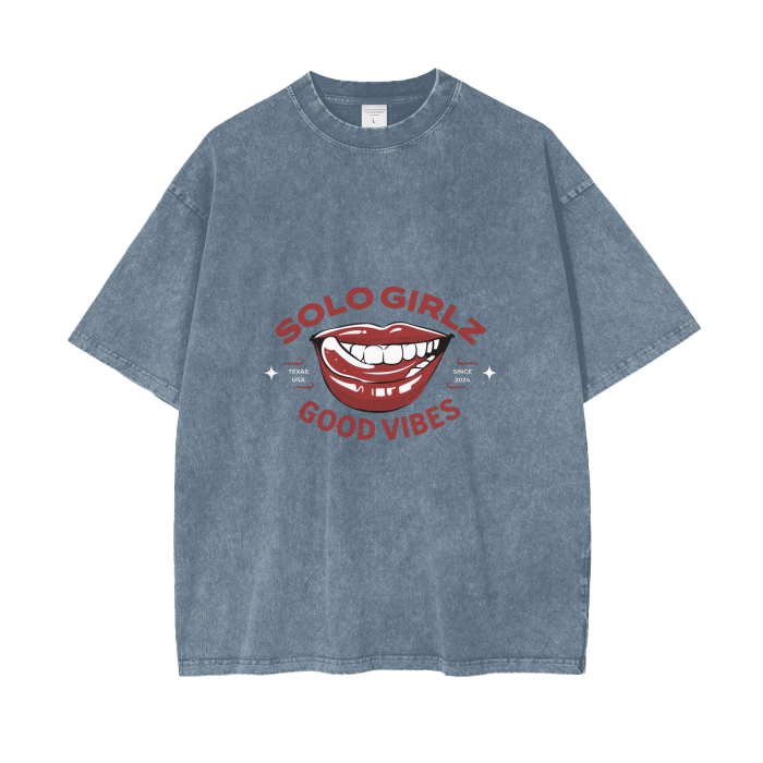 Description: Good vibes only. For those who like to have fun! Oversized T-Shirt that is acid washed with excellent quality in every stitch. It has direct to garment (dtg) printing that is eco friendly and water based, blending ink directly into the fabric. Never worry about print breaking apart! Great in multiple washes!